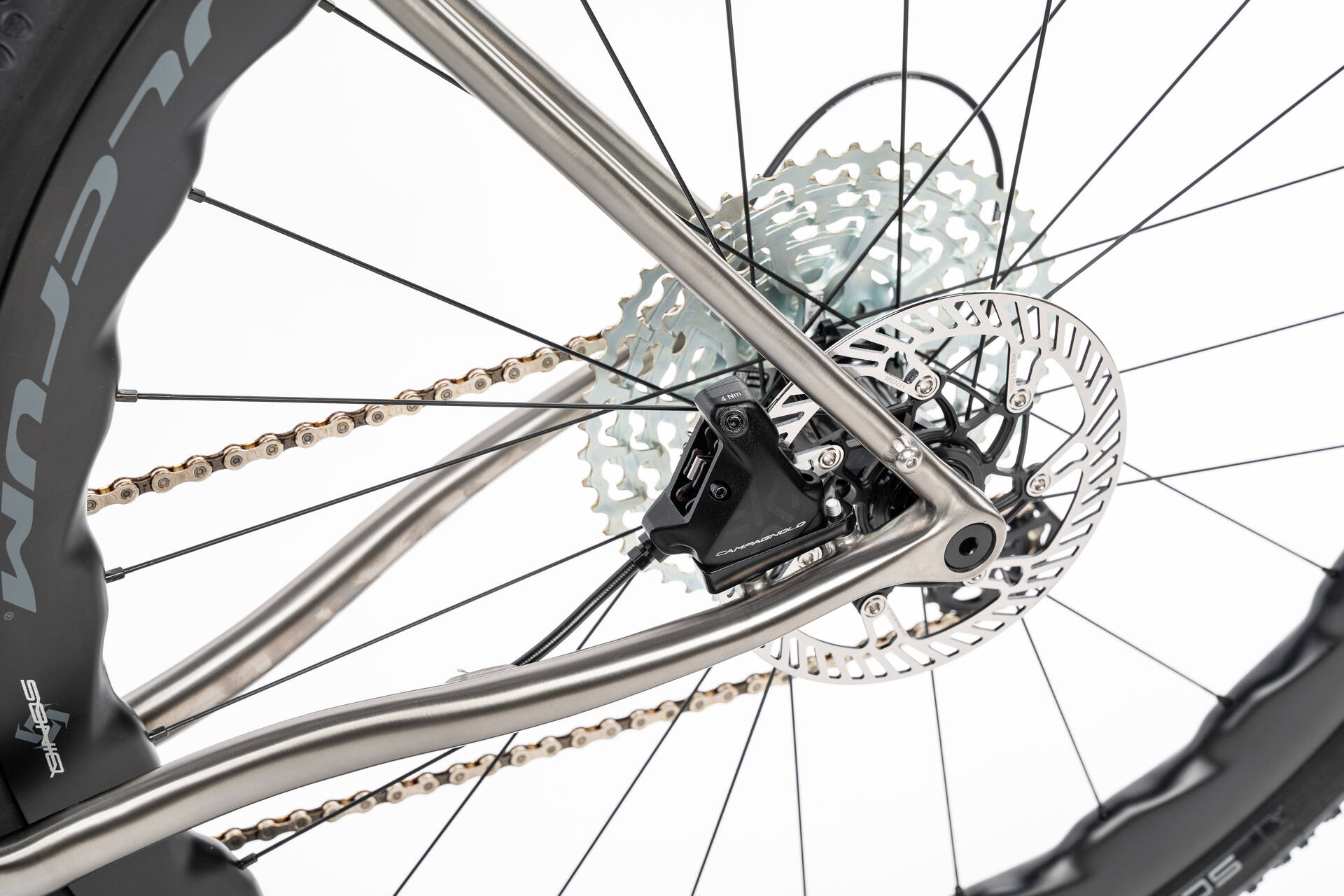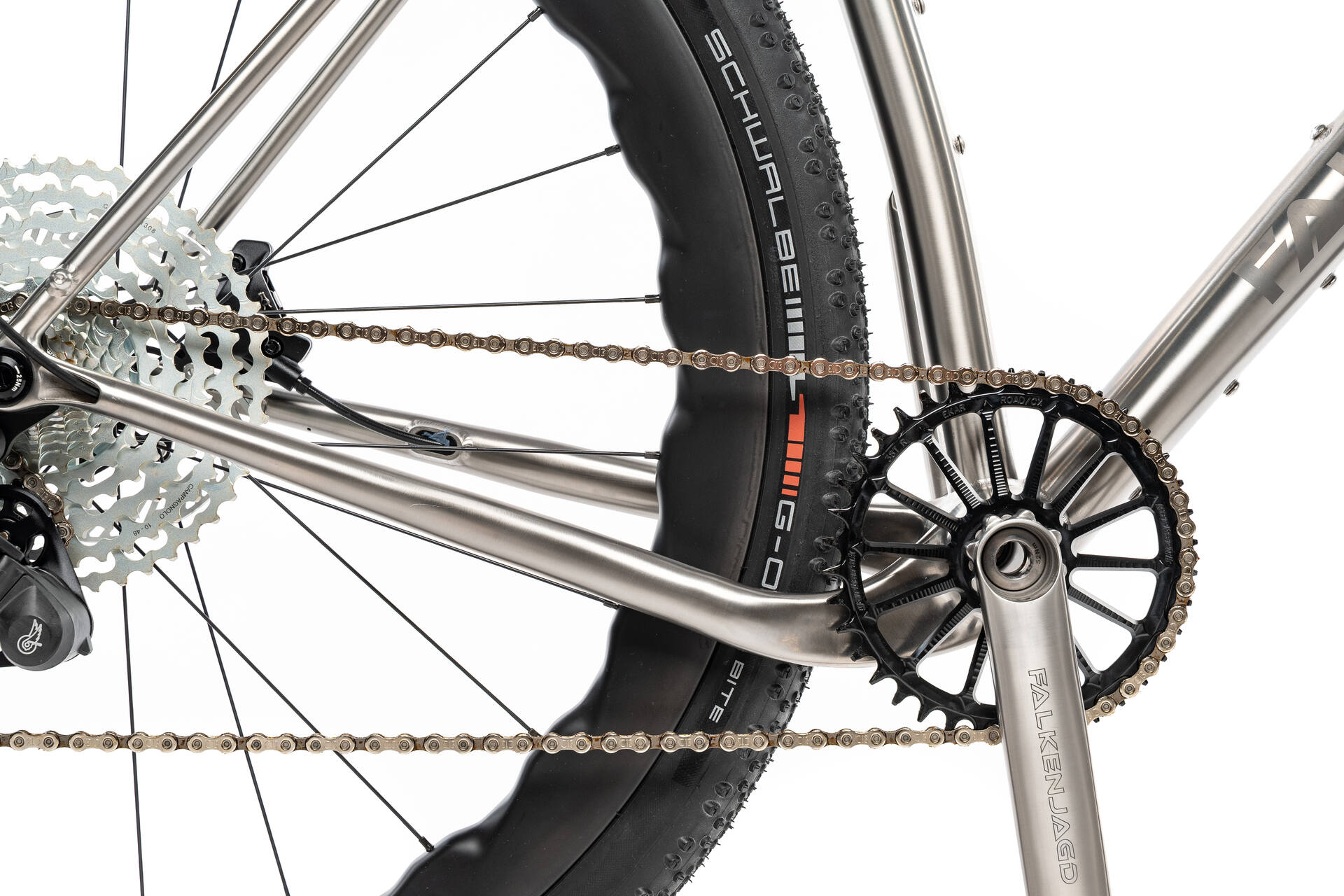 Der 13-fach Campagnolo Ekar Antrieb bietet einen großen Übersetzungsbereich für steile Anstiege und schnelle Passagen. In Kombination mit der Falkenjagd Titan-Kurbel entsteht ein besonders langlebiges, robustes und gleichzeitig leichtes Setup für anspruchsvolle Einsätze.